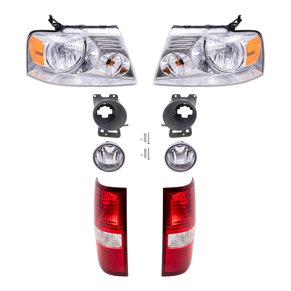 Brock Aftermarket Replacement Driver Left Passenger Right Headlights with Chrome Bezel-Round Fog Lights-Brackets and Styleside Tail Lights 8 Piece Set Compatible with 2006-2008 Ford F-150